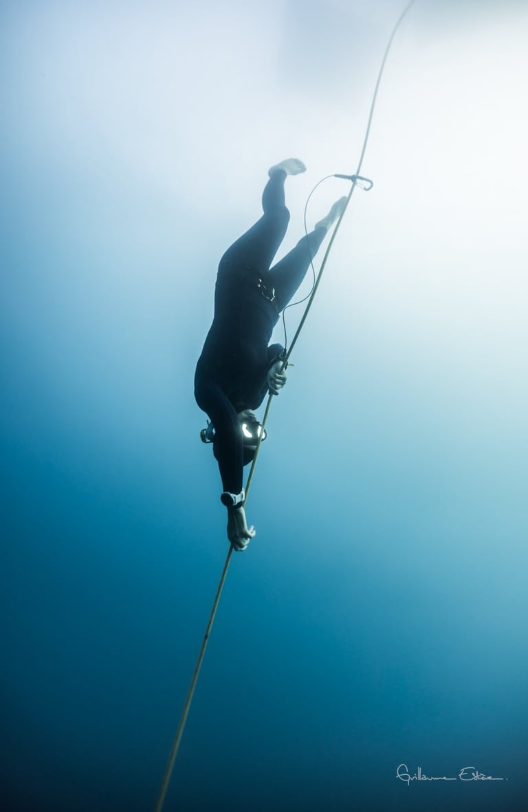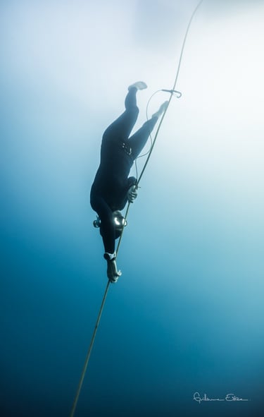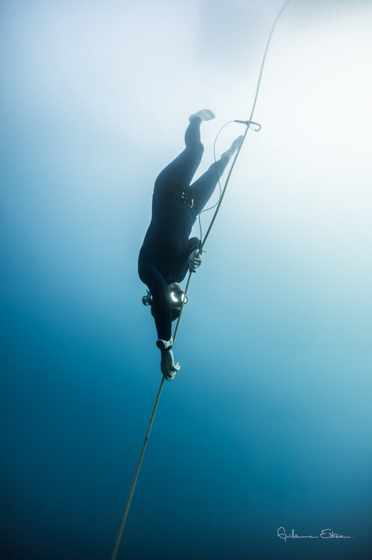 La séance commence par un temps de préparation à sec : exercices de respiration, relaxation guidée et explications techniques sur la compensation, les règles de sécurité, et le fonctionnement du corps en immersion. Guidé.e, vous découvrez ensuite la sensation unique de descendre en apnée le long d’un filin dans le silence du bleu.