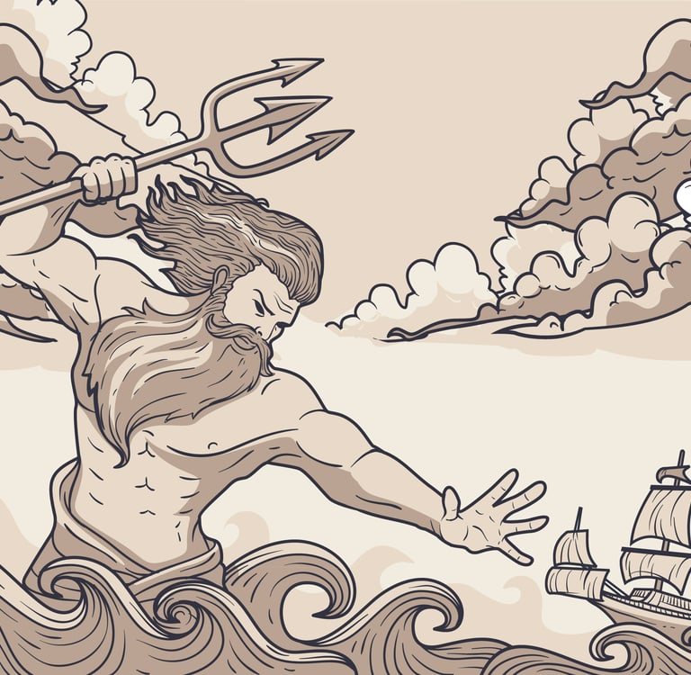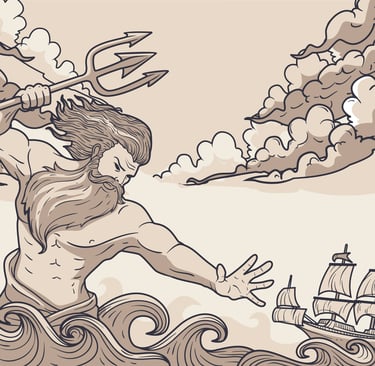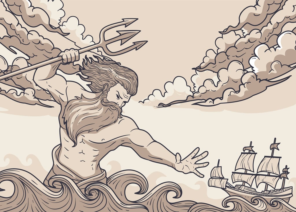 Dans la mythologie grecque et romaine, la mer est habitée par des figures puissantes. Poséidon, ou Neptune chez les Romains, incarne la force brute, la colère comme l’apaisement. Autour de lui gravitent des figures marines : néréides, tritons, divinités secondaires, messagers des profondeurs.